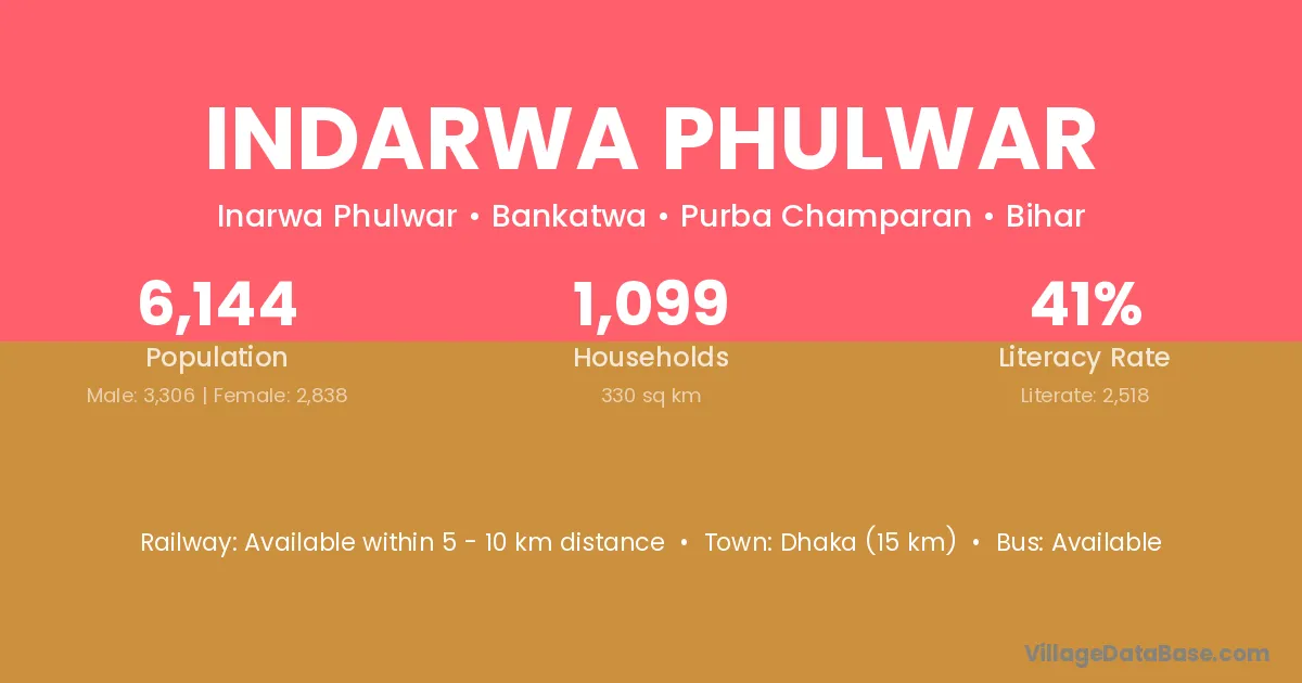 Dhaka (15 km) is the nearest town to Indarwa Phulwar village for major economic activities and is located approximately 15 km away.
