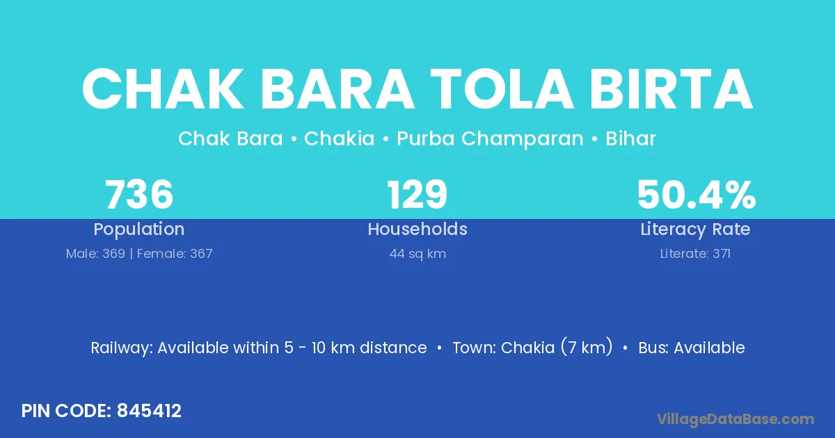 Chakia (7 km) is the nearest town to Chak Bara Tola Birta village for major economic activities and is located approximately 7 km away.