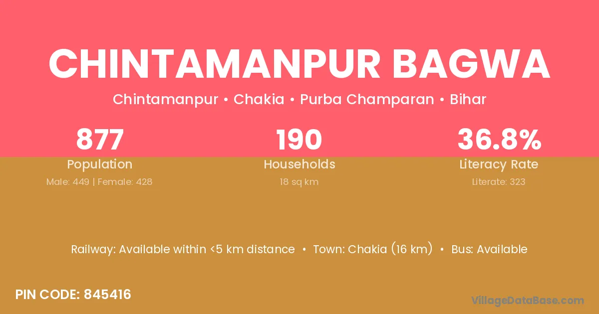 Chakia (16 km) is the nearest town to Chintamanpur Bagwa village for major economic activities and is located approximately 16 km away.