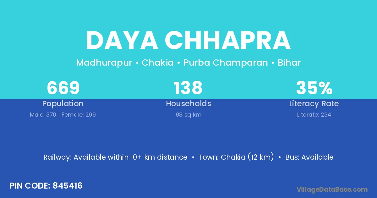 Chakia (12 km) is the nearest town to Daya Chhapra village for major economic activities and is located approximately 12 km away.