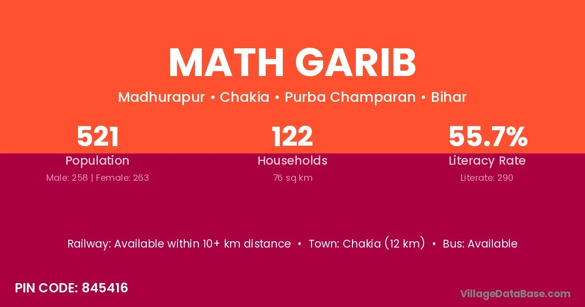 Chakia (12 km) is the nearest town to Math Garib village for major economic activities and is located approximately 12 km away.