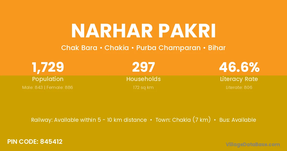 Chakia (7 km) is the nearest town to Narhar Pakri village for major economic activities and is located approximately 7 km away.