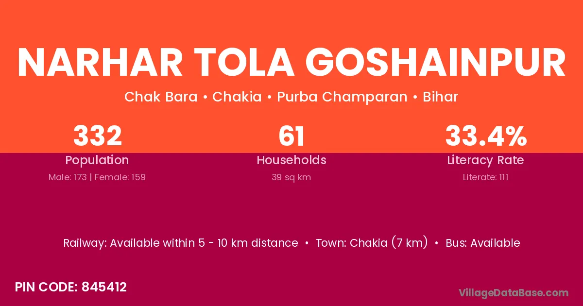 Chakia (7 km) is the nearest town to Narhar Tola Goshainpur village for major economic activities and is located approximately 7 km away.