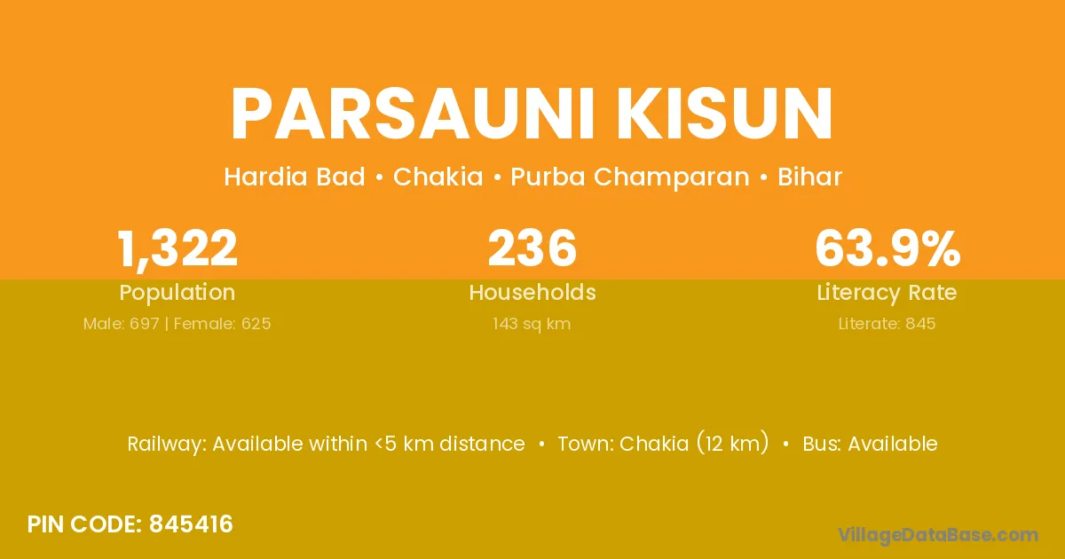 Chakia (12 km) is the nearest town to Parsauni Kisun village for major economic activities and is located approximately 12 km away.