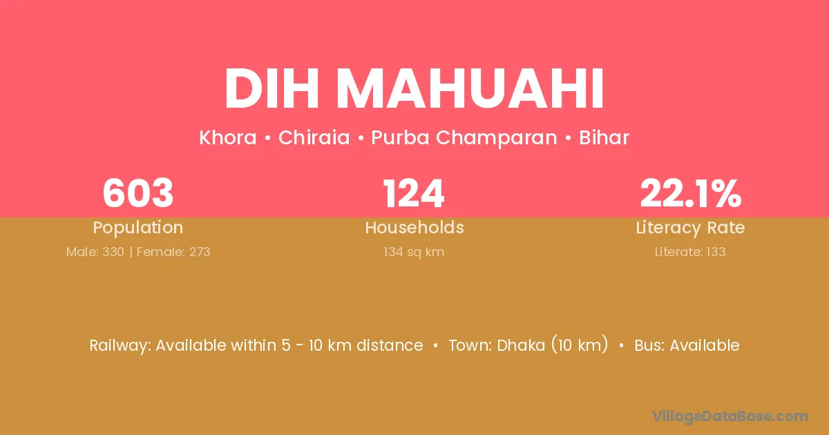 Dih Mahuahi village has a total population of 603 people, of which 330 are males and 273 are females.