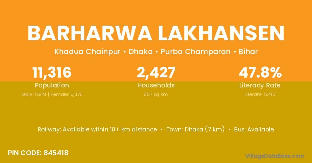 Dhaka (7 km) is the nearest town to Barharwa Lakhansen village for major economic activities and is located approximately 7 km away.