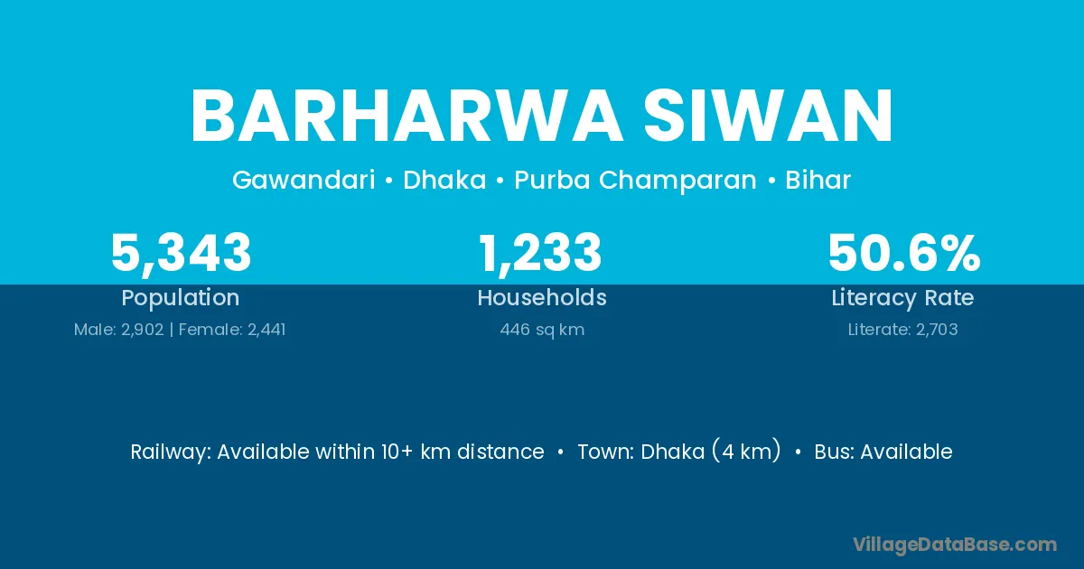 Dhaka (4 km) is the nearest town to Barharwa Siwan village for major economic activities and is located approximately 4 km away.