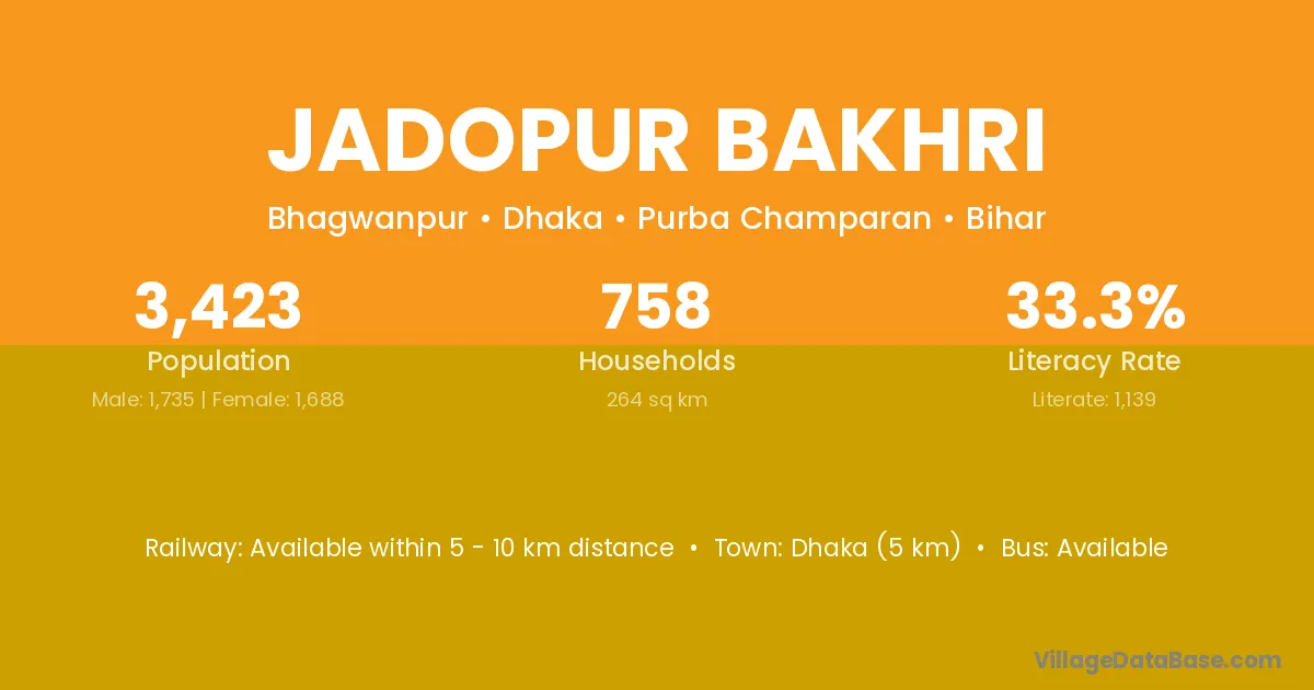 Dhaka (5 km) is the nearest town to Jadopur Bakhri village for major economic activities and is located approximately 5 km away.