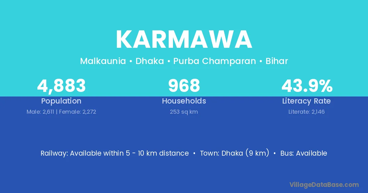 Karmawa village has a total population of 4,883 people, of which 2,611 are males and 2,272 are females.
