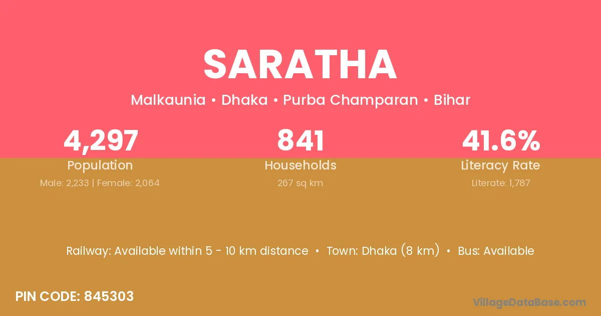 Saratha village is located in the Dhaka Subdivision of the Purba Champaran district in Bihar .
