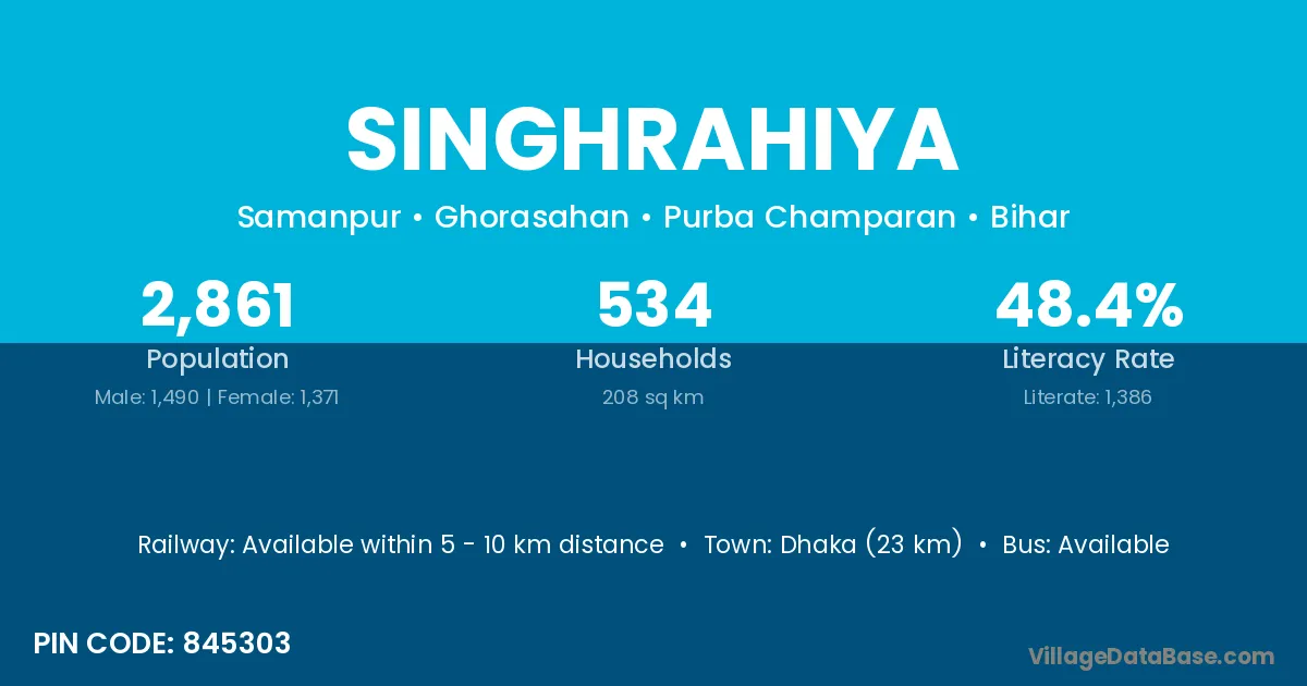 Dhaka (23 km) is the nearest town to Singhrahiya village for major economic activities and is located approximately 23 km away.