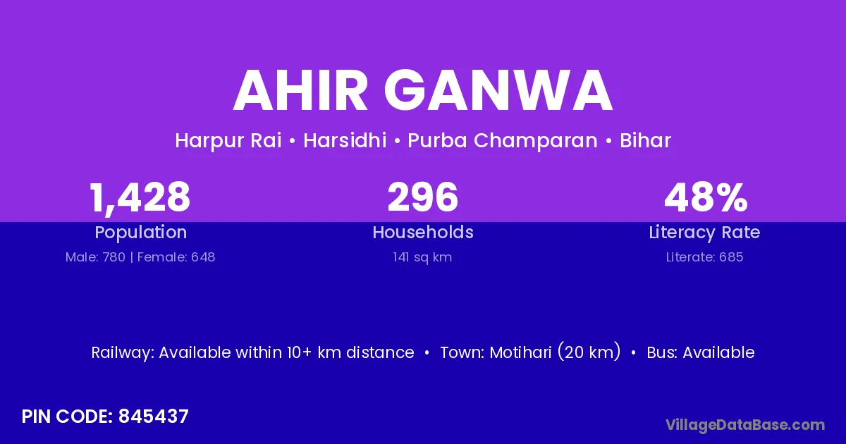 Motihari (20 km) is the nearest town to Ahir Ganwa village for major economic activities and is located approximately 20 km away.