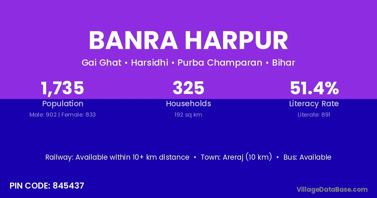Areraj (10 km) is the nearest town to Banra Harpur village for major economic activities and is located approximately 10 km away.