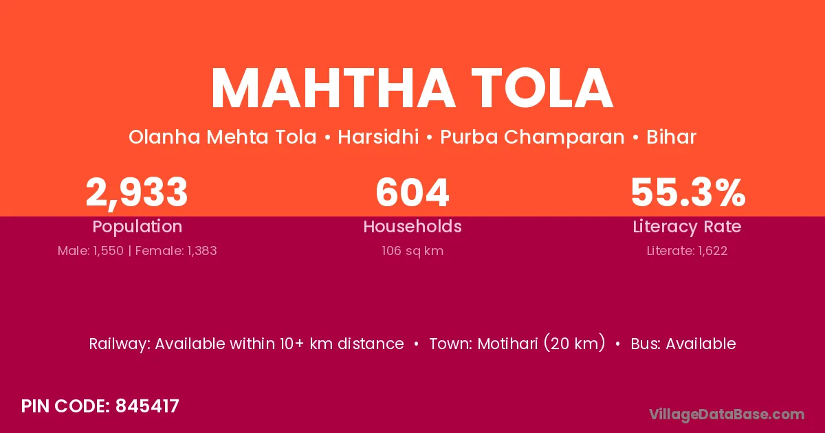 Motihari (20 km) is the nearest town to Mahtha Tola village for major economic activities and is located approximately 20 km away.