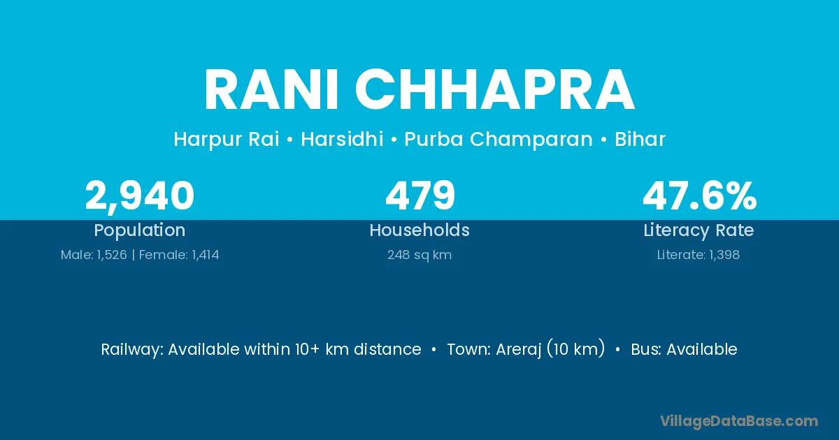 Rani Chhapra village has a total population of 2,940 people, of which 1,526 are males and 1,414 are females.