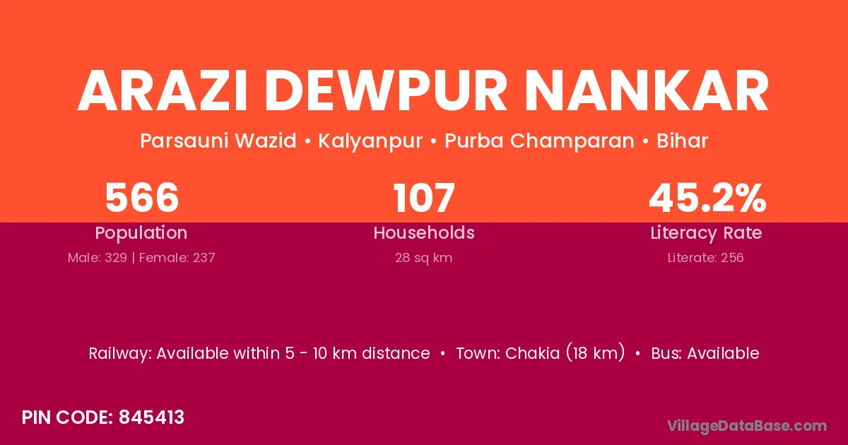 Chakia (18 km) is the nearest town to Arazi Dewpur Nankar village for major economic activities and is located approximately 18 km away.