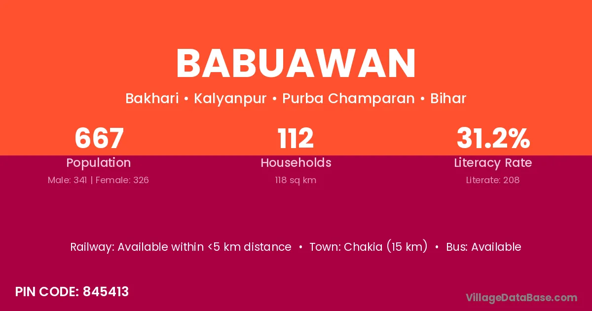 Chakia (15 km) is the nearest town to Babuawan village for major economic activities and is located approximately 15 km away.
