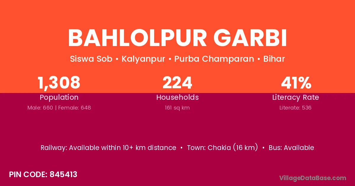 Chakia (16 km) is the nearest town to Bahlolpur Garbi village for major economic activities and is located approximately 16 km away.