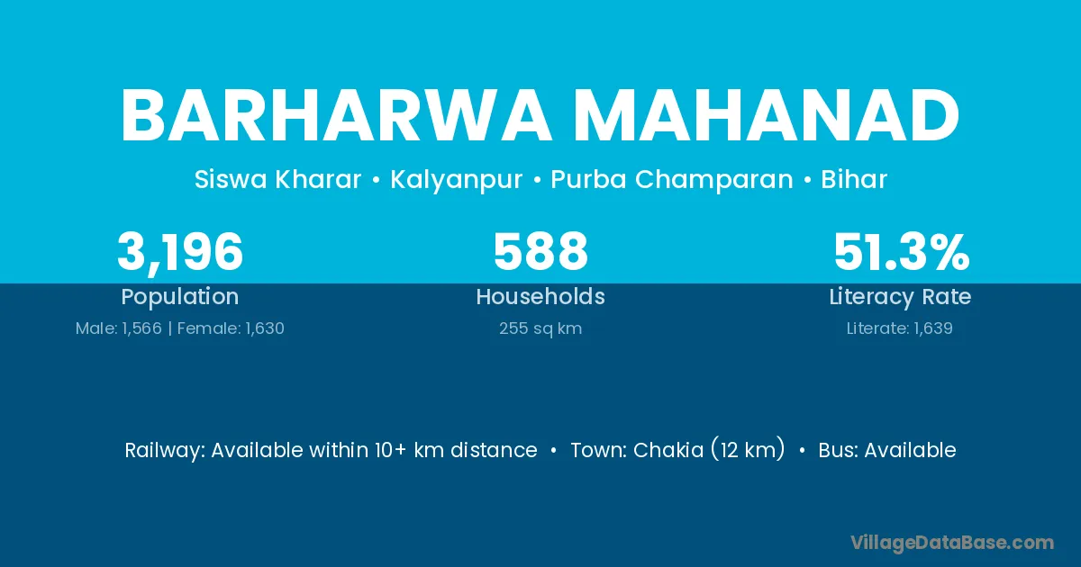 Chakia (12 km) is the nearest town to Barharwa Mahanad village for major economic activities and is located approximately 12 km away.