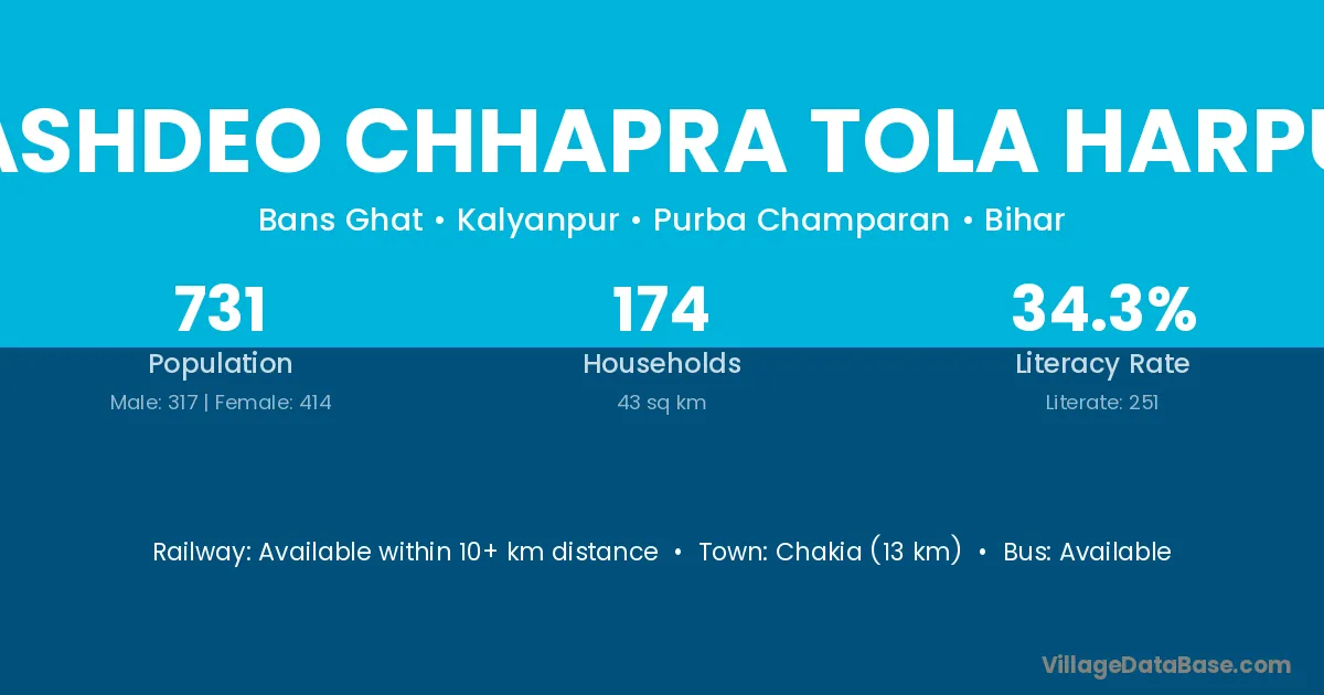 Bashdeo Chhapra Tola Harpur village has a total population of 731 people, of which 317 are males and 414 are females.