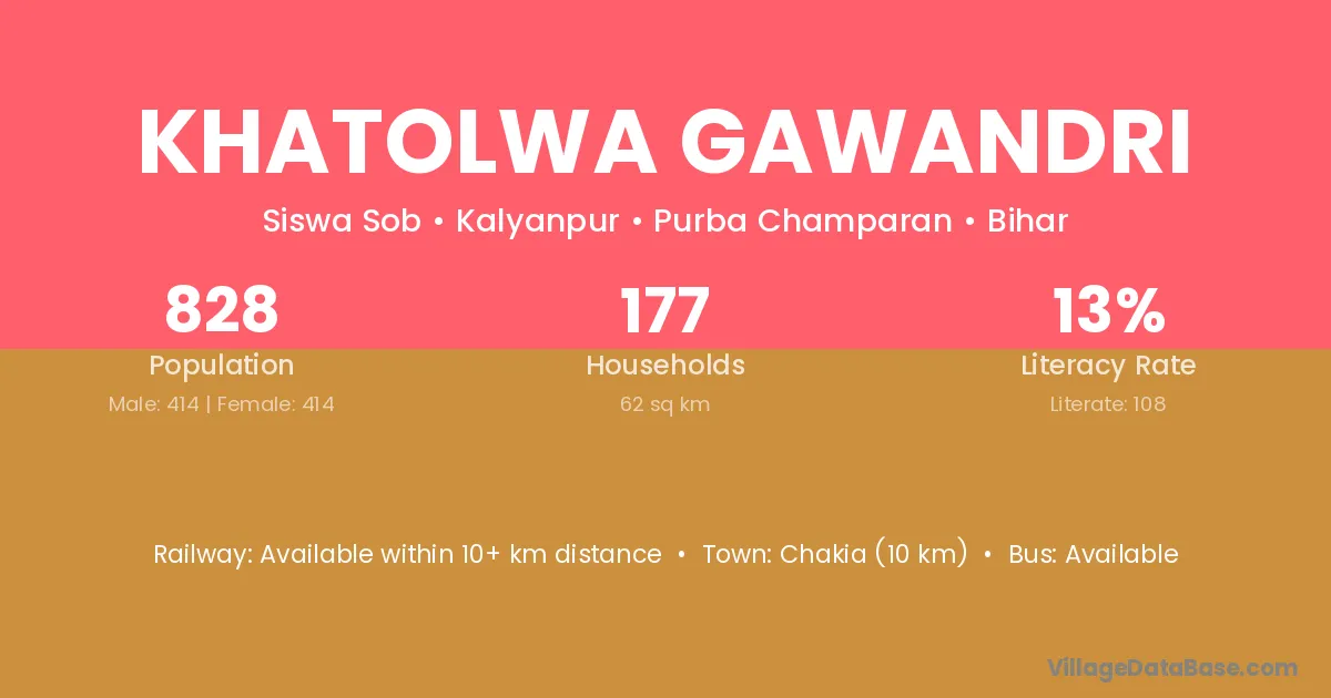 Chakia (10 km) is the nearest town to Khatolwa Gawandri village for major economic activities and is located approximately 10 km away.