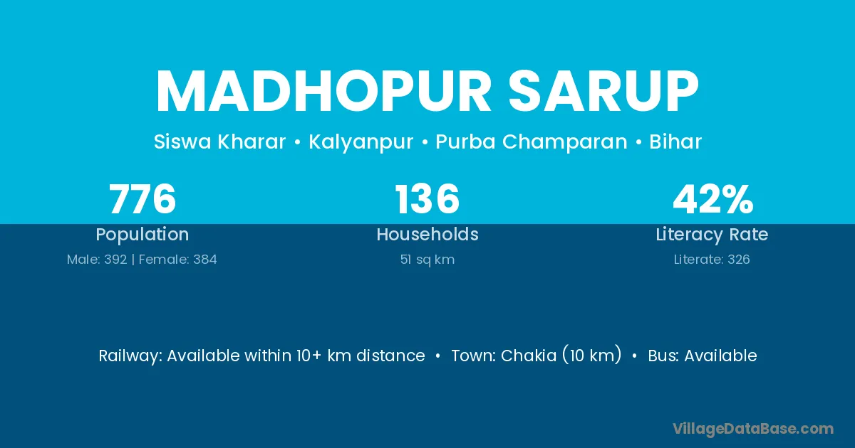 Chakia (10 km) is the nearest town to Madhopur Sarup village for major economic activities and is located approximately 10 km away.