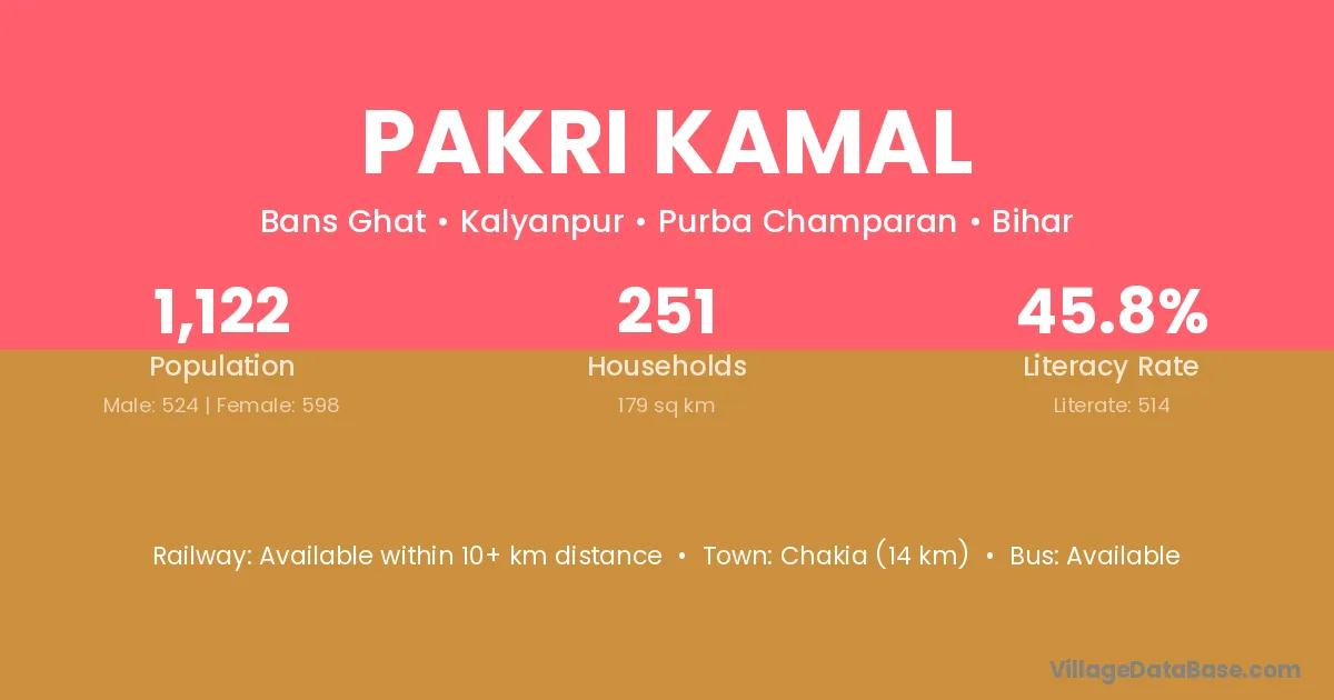 Chakia (14 km) is the nearest town to Pakri Kamal village for major economic activities and is located approximately 14 km away.