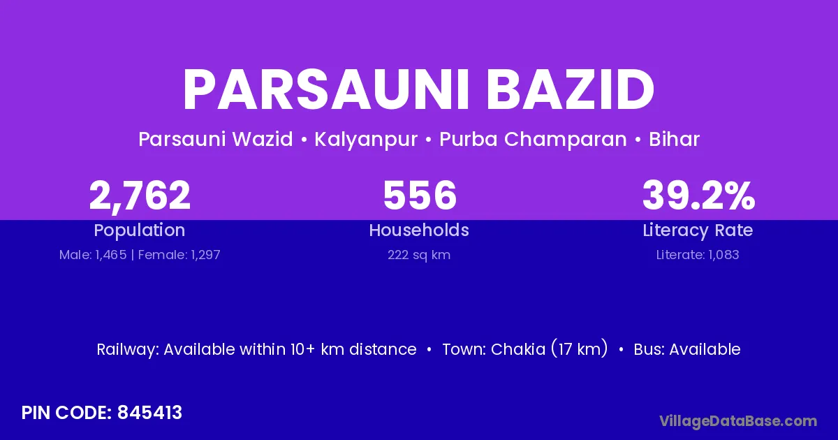 Chakia (17 km) is the nearest town to Parsauni Bazid village for major economic activities and is located approximately 17 km away.