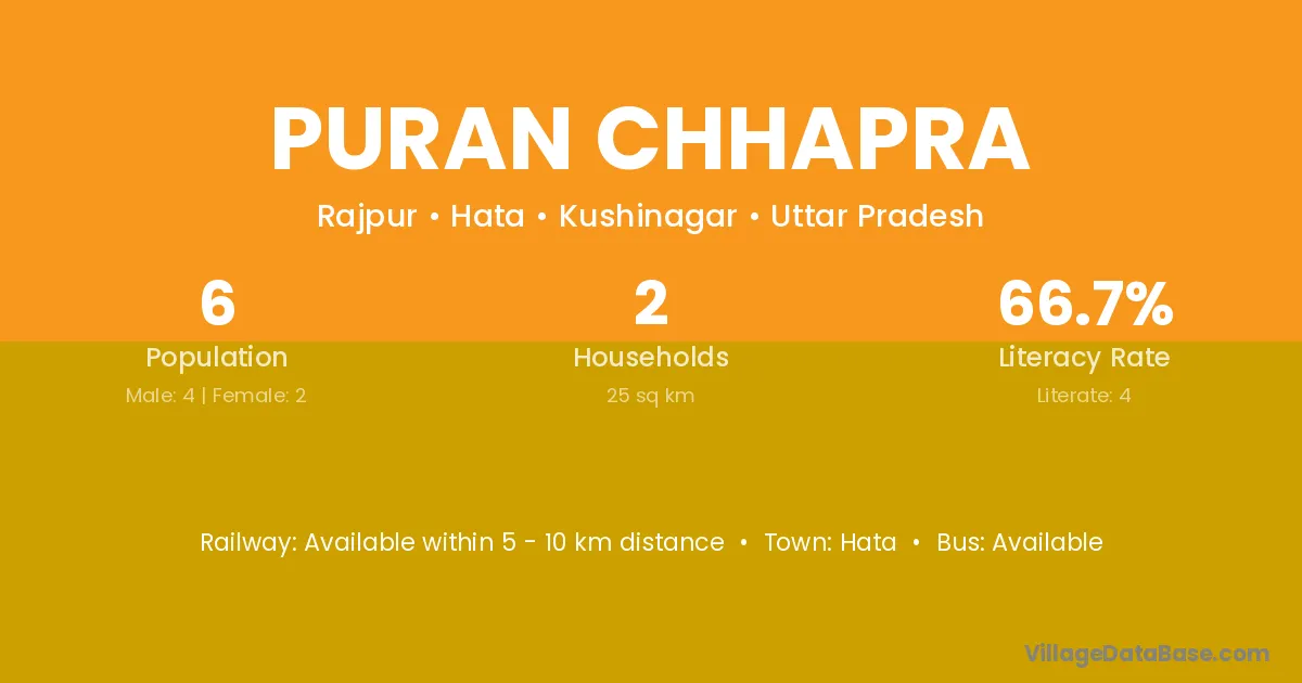 The literacy rate of Puran Chhapra village is 44.08%. Male literacy stands at 51.12% and female literacy at 36.65%.