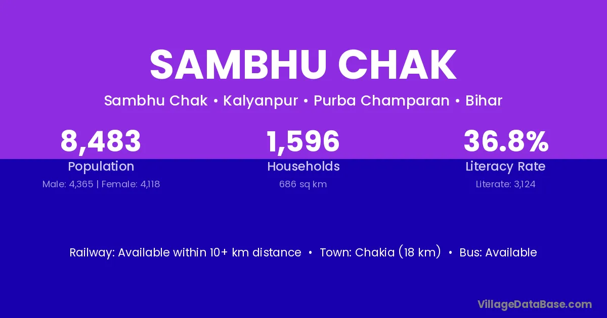 Chakia (18 km) is the nearest town to Sambhu Chak village for major economic activities and is located approximately 18 km away.