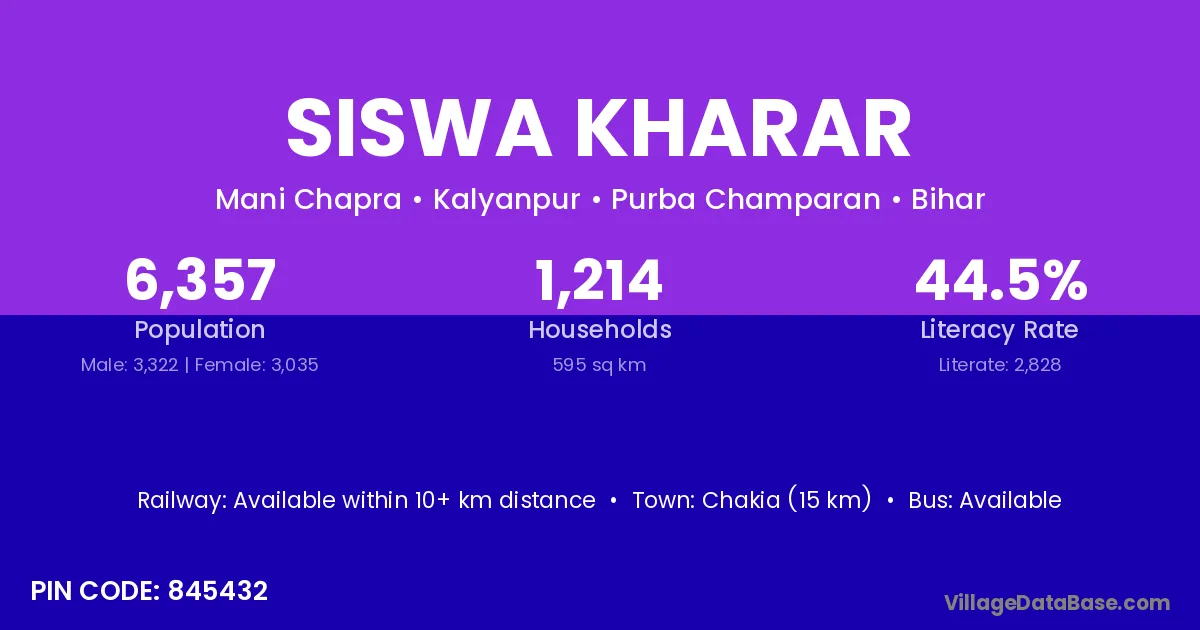 Chakia (15 km) is the nearest town to Siswa Kharar village for major economic activities and is located approximately 15 km away.