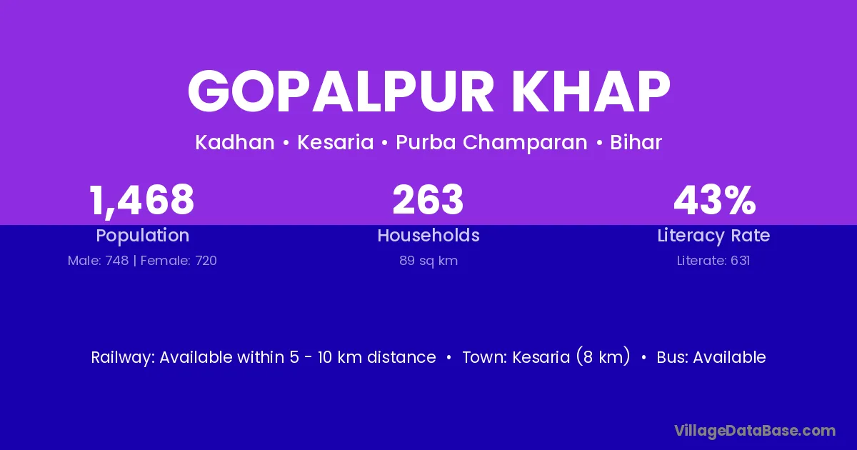 Kesaria (8 km) is the nearest town to Gopalpur Khap village for major economic activities and is located approximately 8 km away.