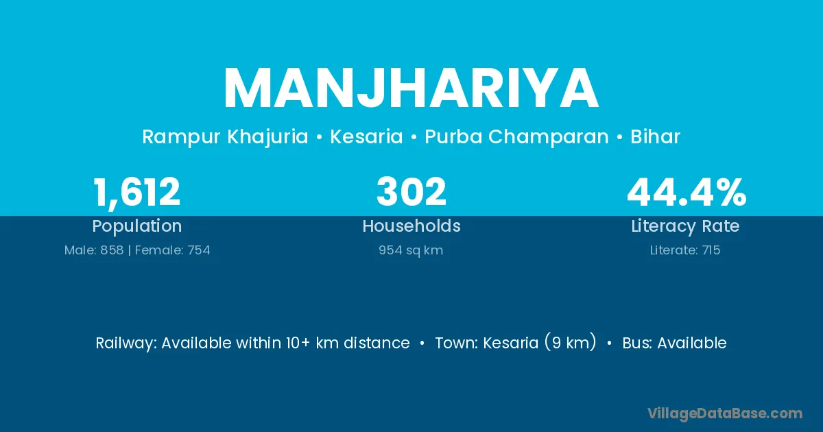 Kesaria (9 km) is the nearest town to Manjhariya village for major economic activities and is located approximately 9 km away.