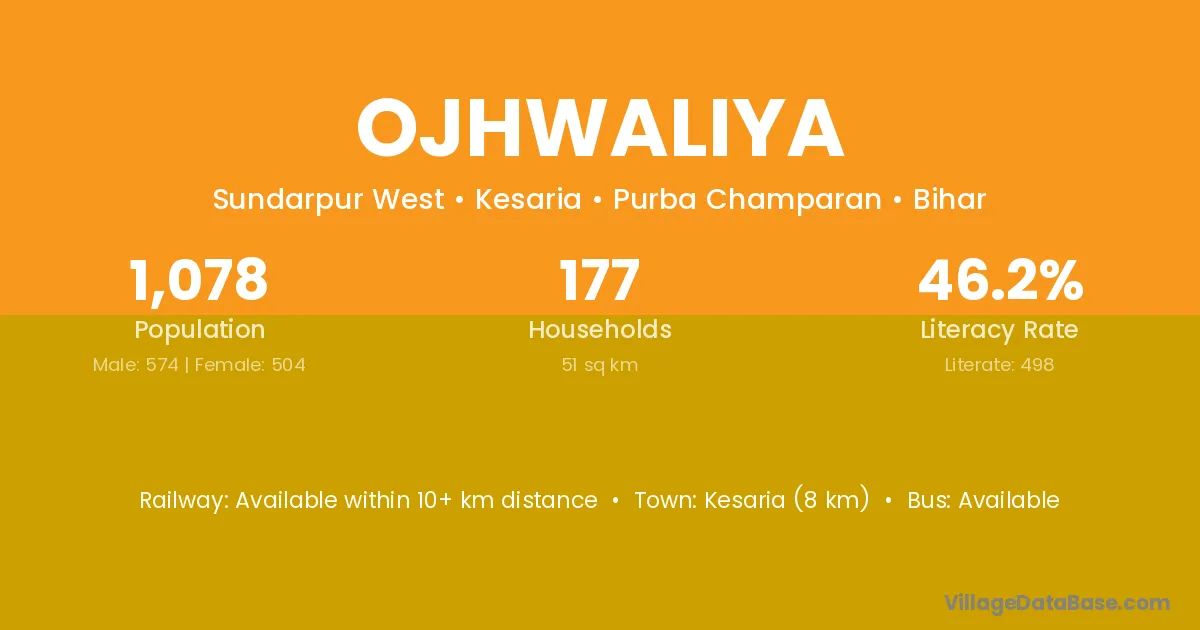 Kesaria (8 km) is the nearest town to Ojhwaliya village for major economic activities and is located approximately 8 km away.