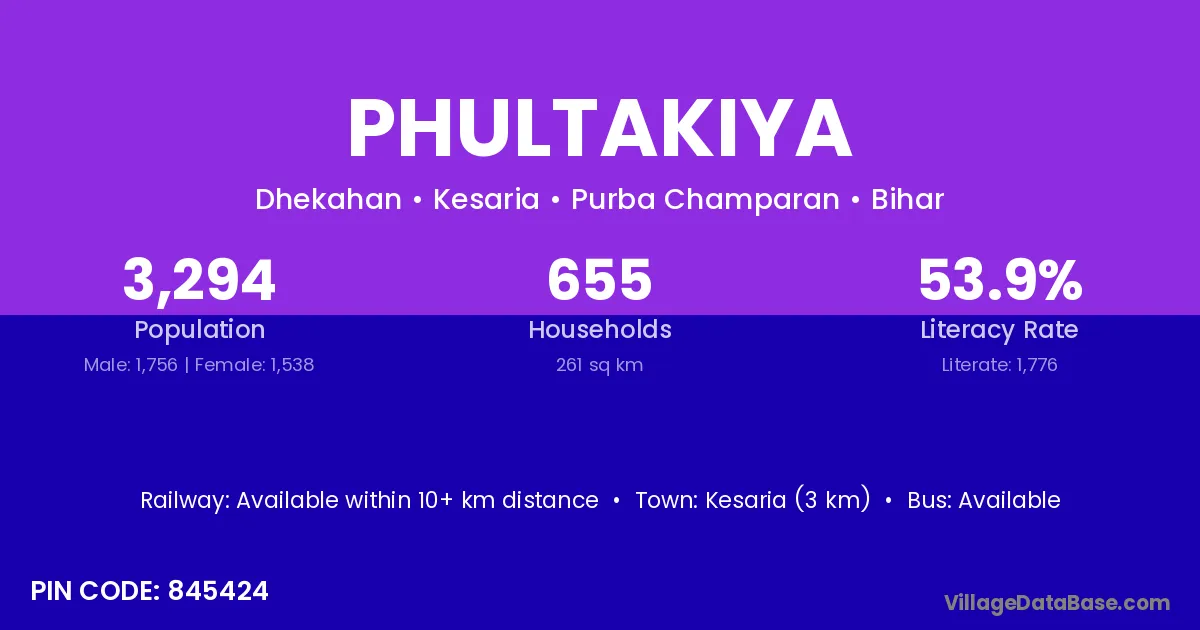 Kesaria (3 km) is the nearest town to Phultakiya village for major economic activities and is located approximately 3 km away.