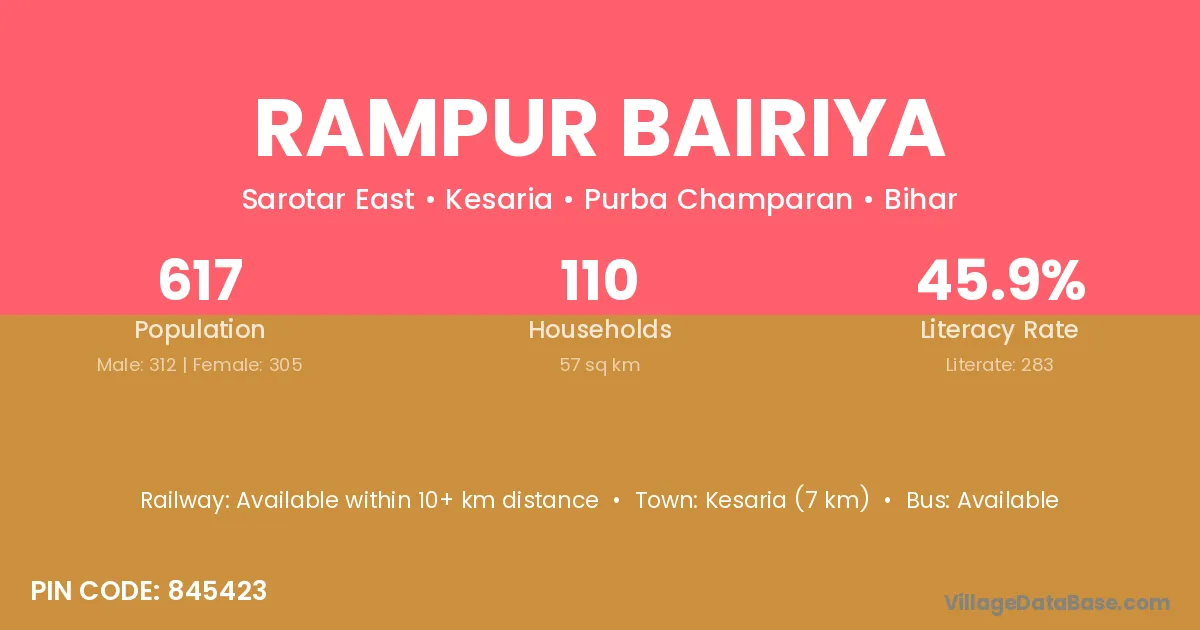 Rampur Bairiya village has a total population of 617 people, of which 312 are males and 305 are females.