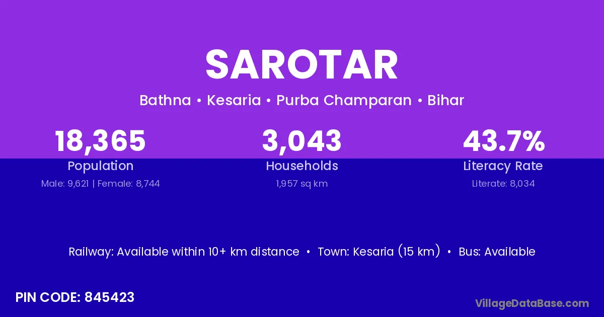 Kesaria (15 km) is the nearest town to Sarotar village for major economic activities and is located approximately 15 km away.