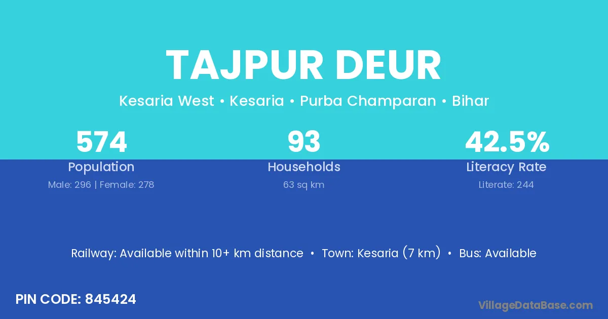 Kesaria (7 km) is the nearest town to Tajpur Deur village for major economic activities and is located approximately 7 km away.