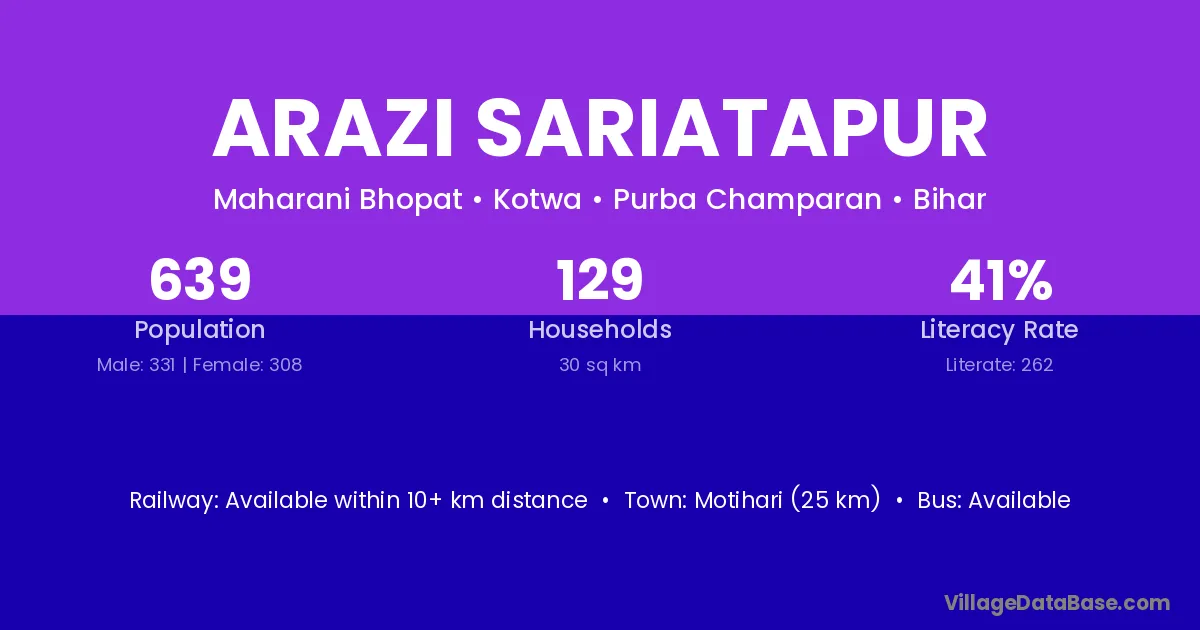 Motihari (25 km) is the nearest town to Arazi Sariatapur village for major economic activities and is located approximately 25 km away.