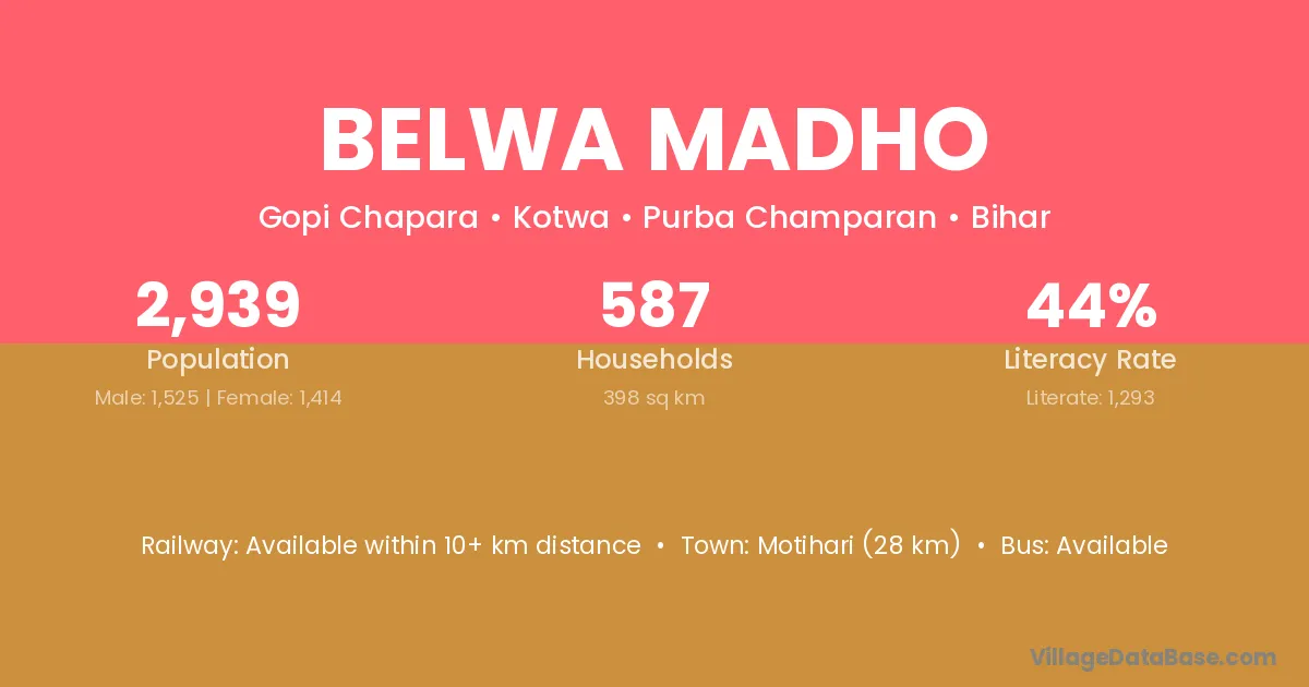 Motihari (28 km) is the nearest town to Belwa Madho village for major economic activities and is located approximately 28 km away.