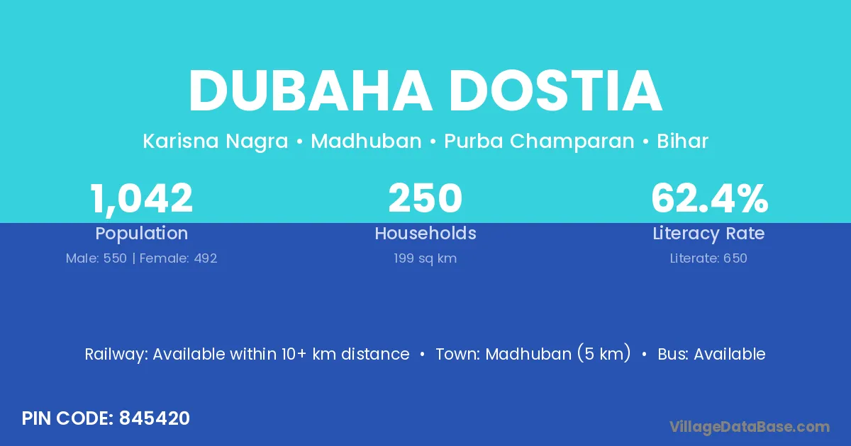 Madhuban (5 km) is the nearest town to Dubaha Dostia village for major economic activities and is located approximately 5 km away.