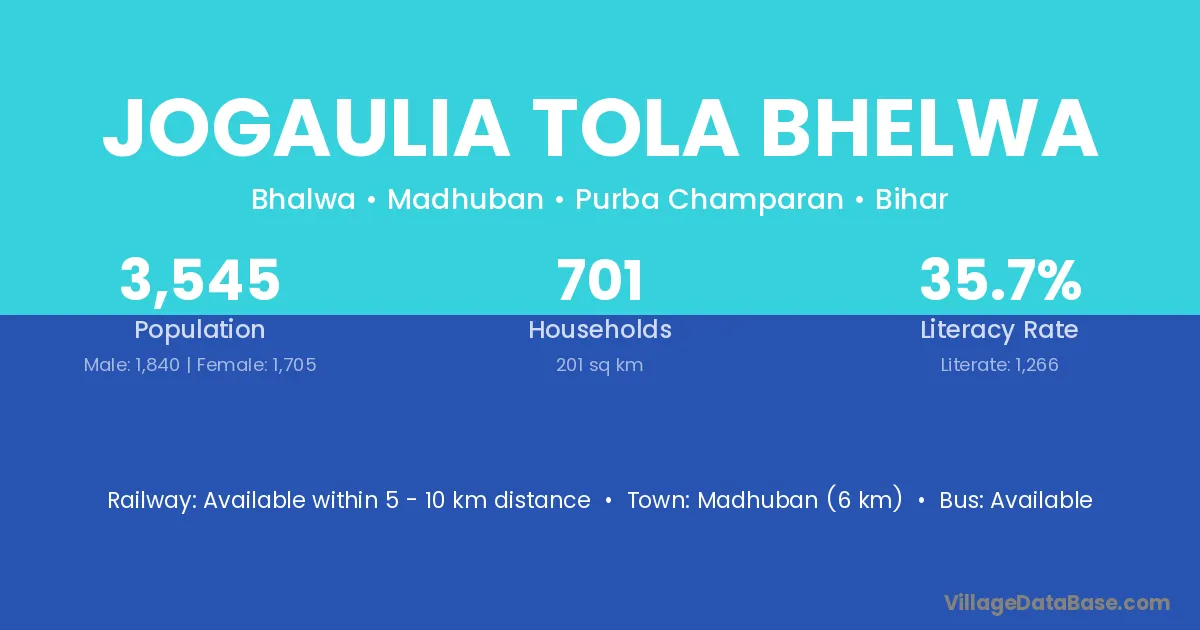 Madhuban (6 km) is the nearest town to Jogaulia Tola Bhelwa village for major economic activities and is located approximately 6 km away.