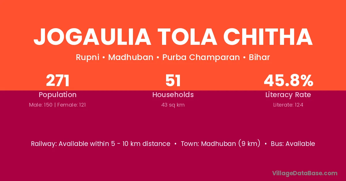 Jogaulia Tola Chitha village has a total population of 271 people, of which 150 are males and 121 are females.
