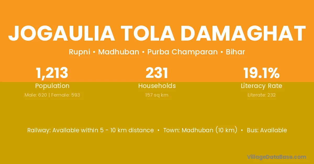 Madhuban (10 km) is the nearest town to Jogaulia Tola Damaghat village for major economic activities and is located approximately 10 km away.