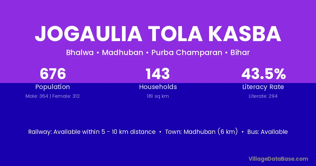 Madhuban (6 km) is the nearest town to Jogaulia Tola Kasba village for major economic activities and is located approximately 6 km away.