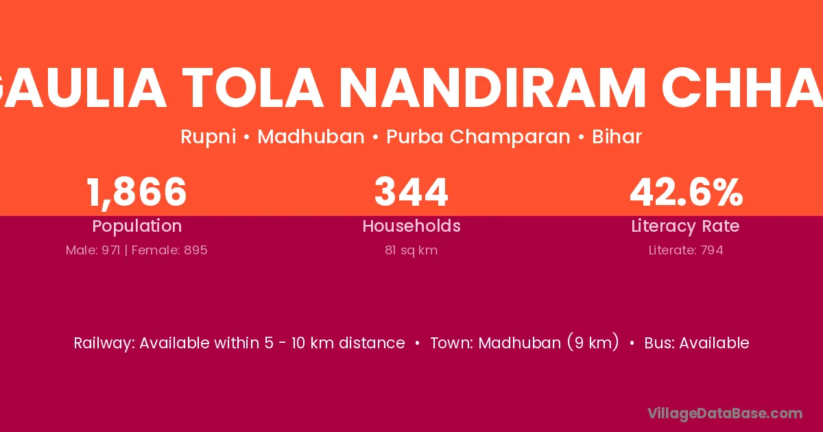 Madhuban (9 km) is the nearest town to Jogaulia Tola Nandiram Chhapra village for major economic activities and is located approximately 9 km away.