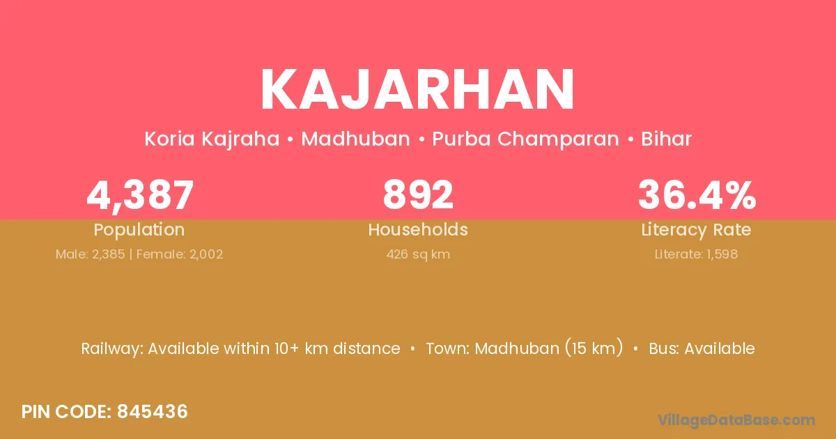 Madhuban (15 km) is the nearest town to Kajarhan village for major economic activities and is located approximately 15 km away.