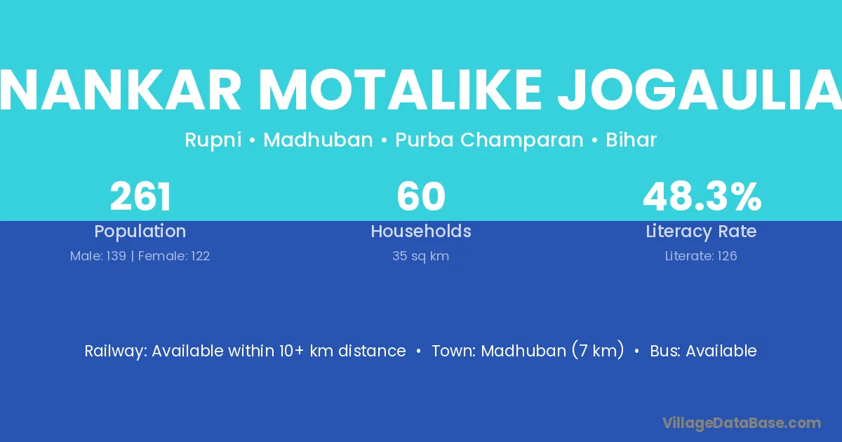 Madhuban (7 km) is the nearest town to Nankar Motalike Jogaulia village for major economic activities and is located approximately 7 km away.