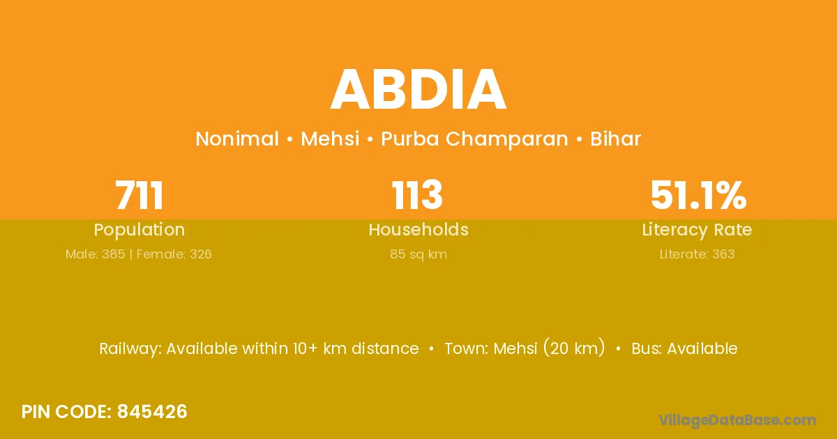 According to Census 2011 information, the village code of Abdia village is 845426.
