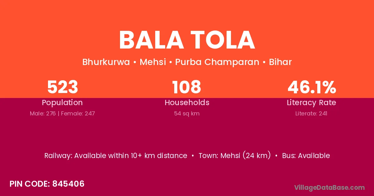 Mehsi (24 km) is the nearest town to Bala Tola village for major economic activities and is located approximately 24 km away.